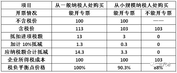 結(jié)論:在能取得增值稅專用發(fā)票的情況下,小規(guī)模納稅人的含稅價應該比一般納稅人便宜3.3元(價格為一般納稅人價格的96.9%);價格高于96.9%,從一般納稅人處購買更合算,反則反之。如果小規(guī)模納稅人不能開專票,小規(guī)模納稅人的含稅價應該比一般納稅人便宜5.85元(價格為一般納稅人價格的94.5%);價格高于94.5%,從一般納稅人處購買更合算,反則反之。